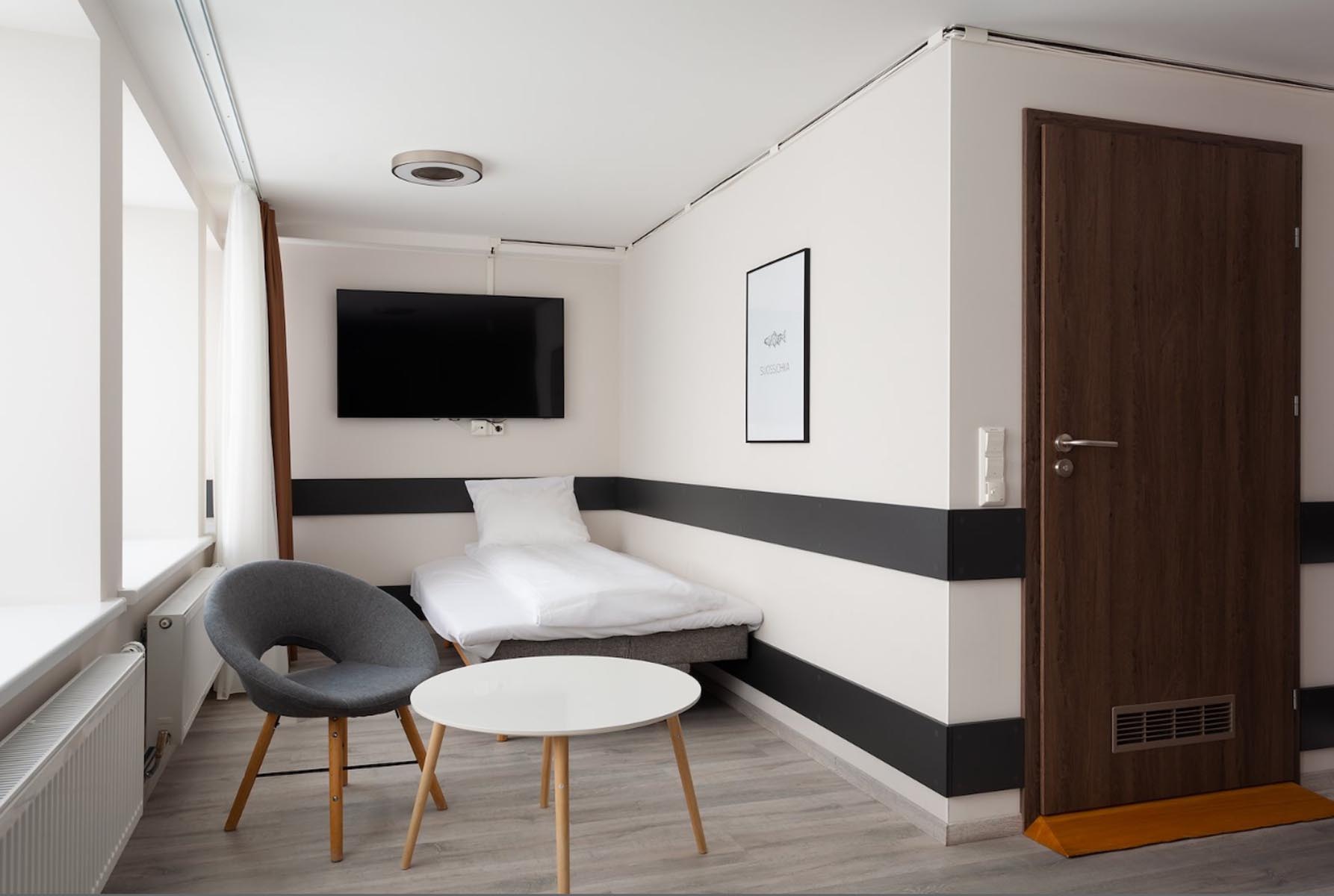 Our accessible Double Room has two single beds (80 or 90 x 200 cm) pushed together, with bedside tables. Breakfast is included, and the room is adapted for wheelchair users with plenty of space, wide doors, a spacious shower, and a ramp into the bathroom.
